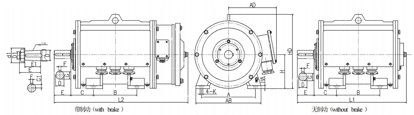 | A | B | C | D | E | F | G | 圆锥形轴伸 | H | K | AB | AD | HA | HD | L1 | L2 | |||||